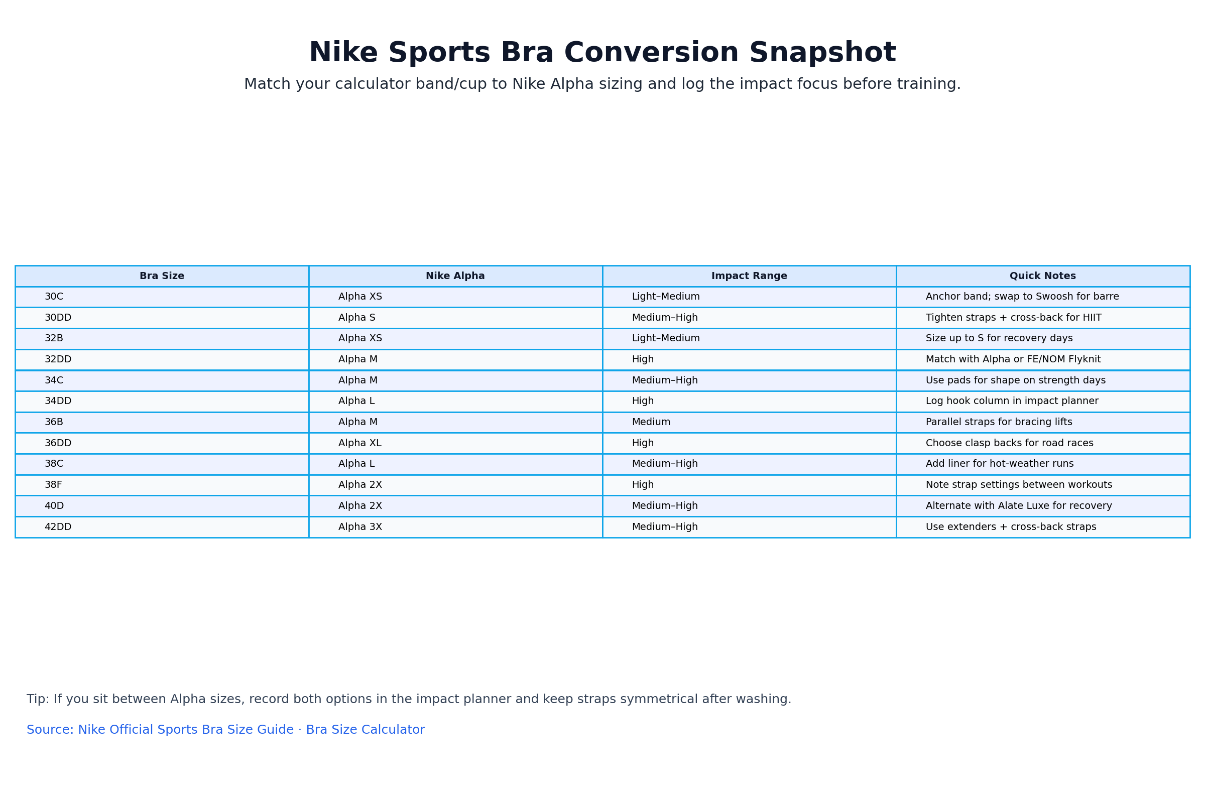 Nike Alpha sizes hug closer than typical everyday bras to manage bounce. Start with the conversion table, then test sister sizes: if the band rides up, drop one band size and increase the cup; if breathing feels restricted, move to the looser sister band.