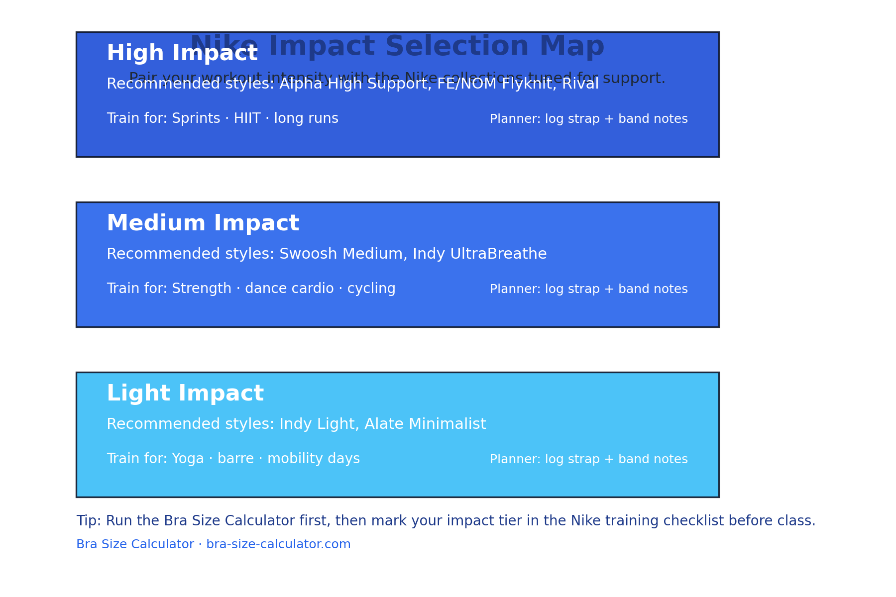 Log your training blocks in the impact planner, then match them to Nike collections with the visual map. Keep a copy handy so you know when to reach for Alpha High Support versus Indy Light days.