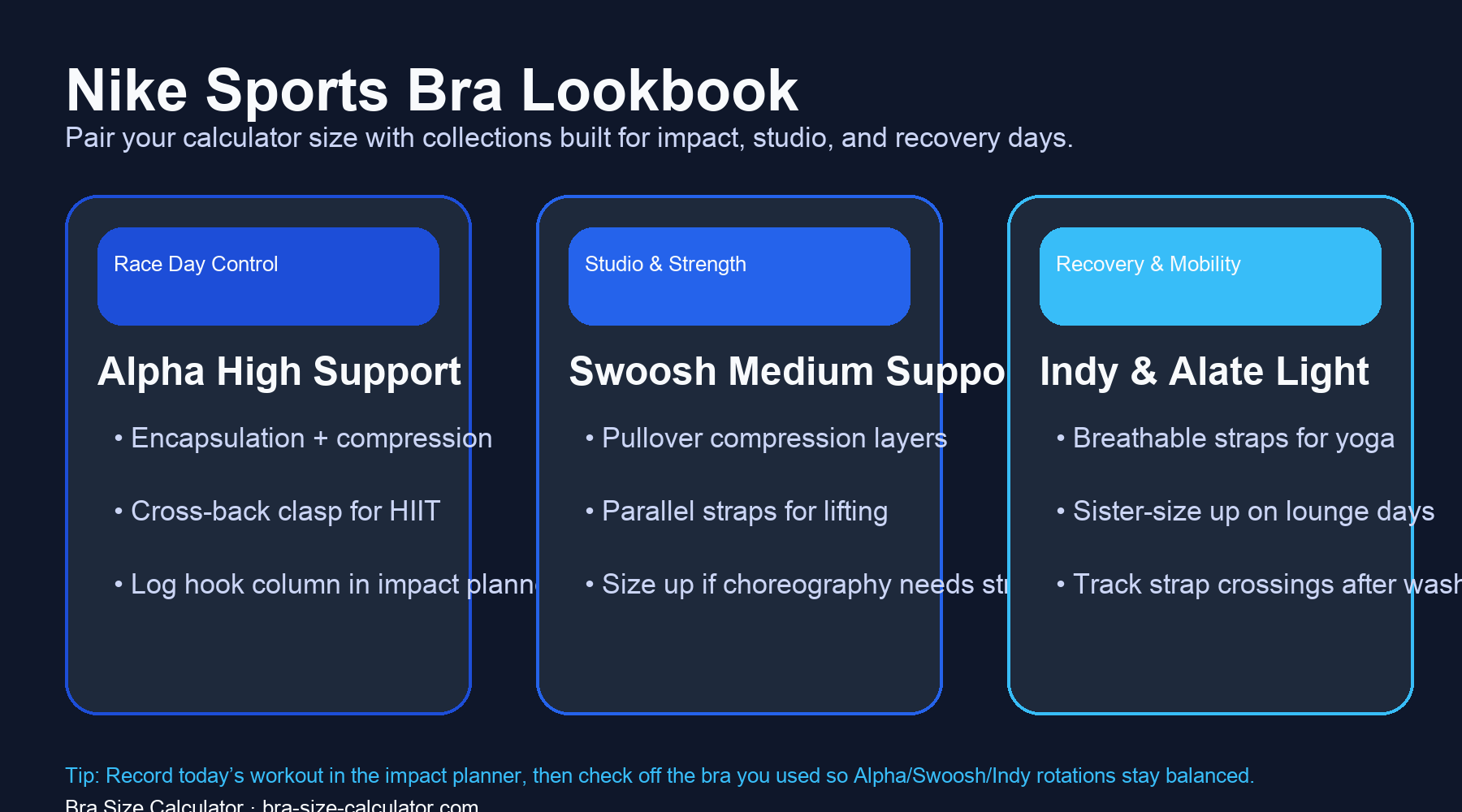 Review the lookbook before you pack your gym bag so Alpha stays reserved for race day, Swoosh handles studio classes, and Indy supports active recovery. Tick off the bra you wore in the impact planner to keep elastic rotation balanced.